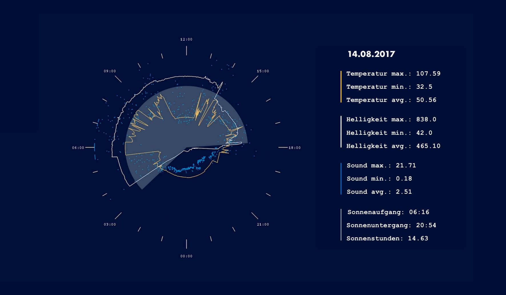 With the dynamic particles we created a component which attract the users attention. The particles represent the students going through the week. The size is mapped to the height of each diagram.